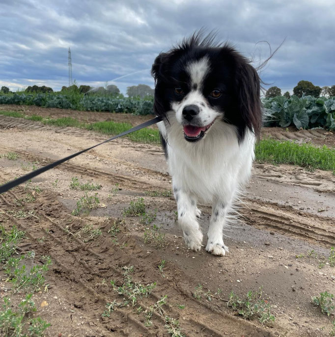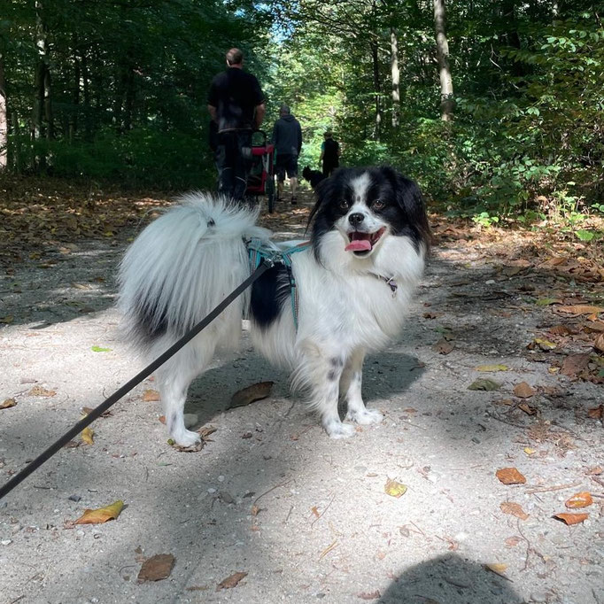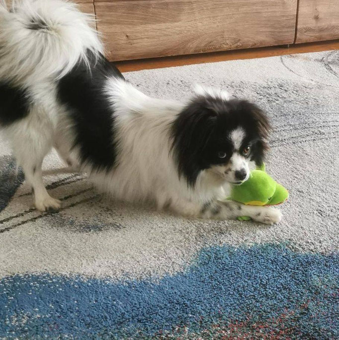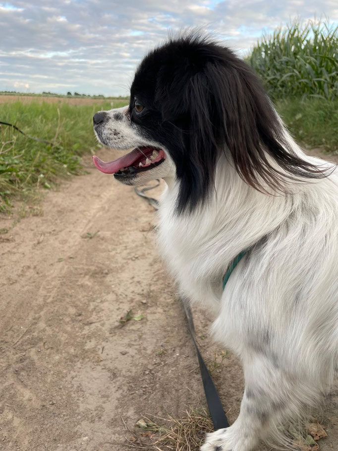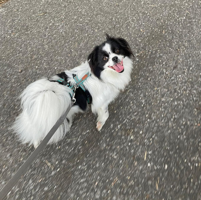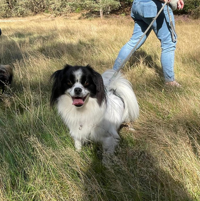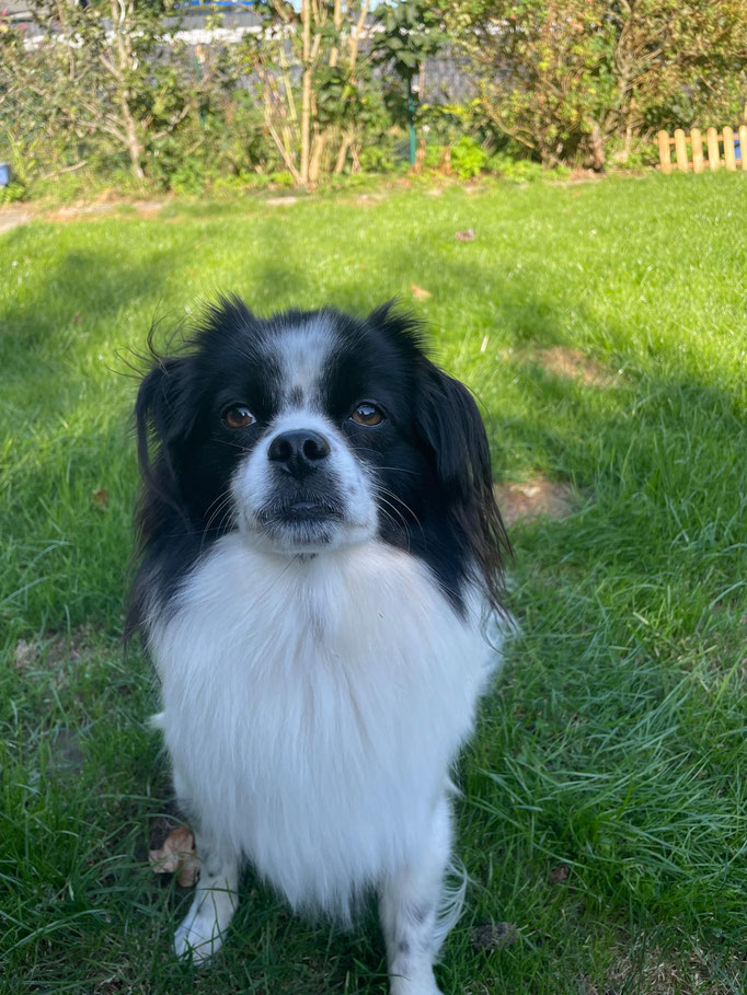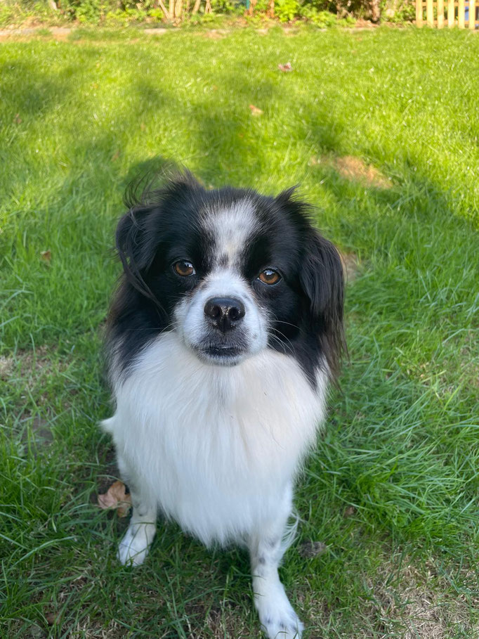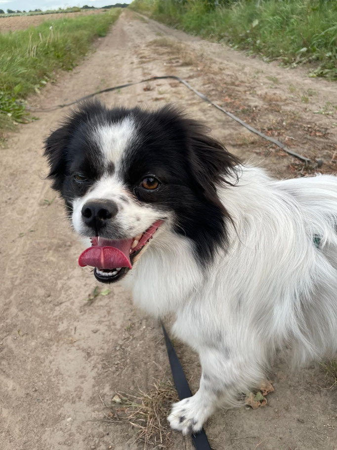 Er läuft toll an der Leine, hört allgemein sehr gut und liebt das Training basierend auf positiver Verstärkung. Auto fahren klappt auch schon ganz gut, ebenso das alleine bleiben.